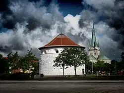 The tower was built in 1687, as a central component of Frederikshavn's fortress. The fortress, originally called the Fladstrand fortress before the town was renamed in the early 19th century, was built to secure the northernmost useful anchorage on the eastern coast of Jutland. This anchorage was a strategically important site for ships sailing to Norway, and played a role in conflicts including the Great Northern War and the Gunboat War. The tower is now the only part of the citadel still standing, but is no longer in the original location: in 1974 it was moved by 270 meters to make room for an expansion of Frederikshavn's shipyard, a move that took 13 months to carry out. It reopened to the public in 1976, as part of Bangsbo Museum.[1][2]