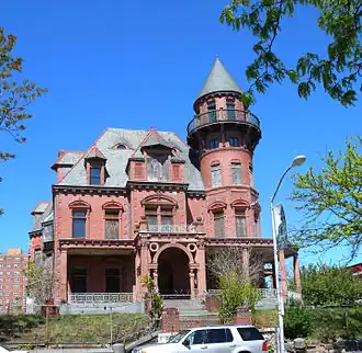 The 40 room mansion was built in 1888 by Gottfried Krueger (1837–1926), founder of Newark's Gottfried Krueger Brewing Company and owner of several other breweries.[5] The construction cost at the time was $250,000. The mansion was sold to the Valley of Newark Scottish Rite Freemasons in 1926 for $100,000. A 700-seat auditorium was added to the mansion to accommodate for various meetings. The mansion was purchased in 1958 by Louise Scott for $85,000. Scott operated a beauty school out of the first floor of the mansion while keeping the upper levels as her private residence. The mansion was added to the New Jersey Register of Historic Places and the National Register of Historic Places in 1972. Scott died in 1982 and ownership of the mansion passed to the city of Newark.[6] In 1991, the New Jersey Historic Trust funded a bond for $625,812 to stabilize the exterior of the building.[7] The city of Newark matched that amount, and over the years devoted more than $4 million to turning the home into a center focusing on the black contribution to Newark's development. The federal government contributed an additional $1.5 million.,[8] but after a decade of work, plans to turn the house into an African-American cultural center were frozen by the city's Municipal Council, which refused to allocate any more money for the project.[8]