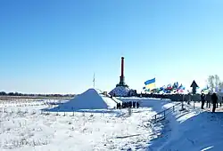 Kruty Heroes Memorial (Ukrainian: Меморіал пам'яті героїв Крут, romanized: Memorial pamiati heroiv Krut) is a monument honoring 500[1] cadets who died defending Kyiv at the Battle of Kruty delaying the advancement of Bolshevik Red Army on January 29, 1918. The memorial is a 10 metre red column situated on a hill and includes a chapel and a cross-shaped lake. It was dedicated by President of Ukraine Viktor Yushchenko in the village of Kruty, Chernihiv Oblast on August 25, 2006.