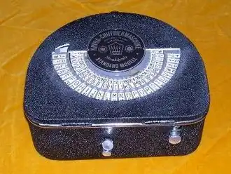 In the history of cryptography, the Kryha machine was a device for encryption and decryption, appearing in the early 1920s and used until the 1950s. The machine was the invention of Alexander von Kryha (born 31.10.1891 in Charkow, Russian Empire, committed suicide in Baden-Baden in 1955).[1] During the Second World War, Kryha worked as an officer for the German Wehrmacht.[1] There were several versions; the standard Kryha machine weighed around five kilograms, and was totally mechanical. A scaled down pocket version was introduced later on, termed the "Lilliput" model.[2] There was also a more bulky electrical version.[3]