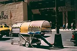 As homelessness reached over 100,000 in late 1980, Wodiczko used the ‘homeless vehicle’ as a source of discussion and discourse. While the artist had produced his first vehicle in Poland with additional conceptual versions designed when he lived in Canada, it was with his Homeless Vehicle Project of 1987–89, that he redirected "attention from the work of art as dissent to the work of art as social action: in this case, the discussions and design collaboration with members of the homeless community to develop both a physical object and a conceptual design that would make their participation in the urban economy visible and self-directed."[13] Wodiczko's cart consisted of “a storage area for personal belongings, a washbasin that doubled as support for a table, a bin to hold cans and bottles, and, beneath its roof, just enough space for a desperate homeless man to sleep” [14] The cart was used in New York and Philadelphia. The art sparked outrage as people thought the cart took up too much space resulting in the audience reaction becoming part of the art itself. The Homeless Vehicle Project was both symbolic and useful: the artist's first work to use a collective process to legitimize the problems of a marginal community "without legitimating the crisis of homelessness."[15] While the public was cautious, the operators of the vehicles took the project seriously. According to Wodiczko, "You see this in certain gestures, certain ways of behaving, speaking, dialoguing, of building up stories, narratives: the homeless become actors, orators, workers, all things which they usually are not. The idea is to let them speak and tell their own stories, to let them be legitimate actors on the urban stage."[16] The attention to testimony as a transformative process while still tentative in the Homeless Vehicle Project became a significant performative process in the artist's Instruments and eventually part of his projections as well.[17] Through this art piece, Wodiczko was able to amplify the issue of homelessness in a society that dehumanizes and strips homeless people of their voice.