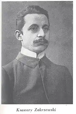 Ksawery Faustyn Ignacy Zakrzewski (15 February 1876 in Wełna [now Goślinowo] – 18 November 1915 in Poznań) was a Polish physician, independence activist, director of Poznań's Polish Gymnastic Society "Falcon", co-editor of biweekly magazine Sokół, co-founder (with Marian Seyda) of magazine Kurier Poznański. According to Bernard Chrzanowski, Zakrzewski was an initiator and co-creator of scouting in Greater Poland. He was one of the main organiser of Polish scouting in the Prussian partition of Poland.