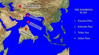 Around 50 million years ago, the Indian plate collided with the southern subduction zone of the Kshiroda oceanic plate causing the plate to shrink. It was pushed northwards and eventually collapsed more than 40 million years ago.[3] It was pushed below the crust of the Eurasian plate and this led to the formation of the Tibetan Plateau and the Himalayas.