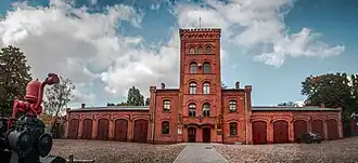 Starting from the 1870s, another Scheibler factory complex began to grow - on an unprecedented scale - "Księży Młyn" (according to the design by Hilary Majewski - although this attribute raises serious doubts[1]), with the largest cotton spinning building in Łódź ( 207 m long), a housing estate for workers, residential houses Families, the so-called factory shop consumer, fire brigade, hospital, school, palace complex and park with a pond. Currently, this compact residential and industrial district, which is an unusual "city in the city", is one of the most interesting industrial monuments in the world. The factory complex at Księży Młyn - also known as Pfaffendorf in German - is the first assumption on this scale, later unsurpassed, assuming the characteristic layout for Łódź: a factory - a residence - a housing estate. This is one of the best implementations of this kind, not only in Poland, but also in Europe.[2] As a complex, it has been entered in the register of monuments, and efforts have been made for several years to make it a UNESCO World Heritage Site.