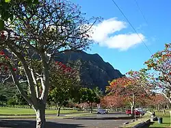Kualoa Regional Park is located at Kāneʻohe Bay, on the island of Oahu in the U.S. state of Hawaii. The park covers 153 acres (61.92 ha; 0.24 sq mi) across the road from the Pali-ku (cliffs) of the Koʻolau Range. The beach front is white sand[1] and 1/3 mile offshore is the small basalt island of Mokoliʻi (or Chinaman's Hat).