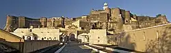 Perched atop a 1,000-foot-high (300 m) cliff, the Kuchaman Fort is the most important attraction in Kuchaman. It was built by a Sikh Empire ruler during 1809–1832.[31][32] Currently a heritage hotel, the fort displays a rich collection of original inlay work in semi-precious stones, glass, and gold paint. The Sheesh Mahal (glass palace) is a sight for marvel. A colourful bazaar, located below the fort, is a great place to shop for handicrafts and fabrics.