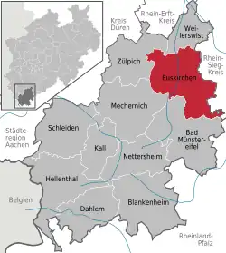 Euskirchen (district)North Rhine-WestphaliaRhein-Sieg-KreisRhein-Erft-KreisDüren (district)Rhineland-PalatinateAachen (district)BelgiumBlankenheimEuskirchenSchleidenBad MünstereifelWeilerswistHellenthalNettersheimMechernichZülpichKallDahlem