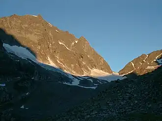 The Kuchenspitze is the second highest peak in the Verwall Group after the Hoher Riffler. Its main summit is not the 3148 spot height, but the peak to the south; to the north are several other subpeaks.[1] The mountain is glaciated. In its north cirque (Nordkar) is the Großer Kuchenferner; to the west, the Kleiner Kuchenferner; and, to the south, between the main summit and the subpeak of the Küchlspitze (3,147 m), is the Großer Küchlferner. The ridge continues northwards via the col of Kuchenjöchl (2,730 m) to the Scheibler (2,978 m) and the Kartell Group above St. Anton. The Kuchenspitze is a little to the north of the main chain of the Verwall, which runs over the Küchlspitze. The entire west side of the mountain drains into the Kartellspeicher reservoir and the Moosbach into the Rosanna, the west flank into the Fasulbach, which empties into the upper Rosanna.