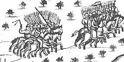 In 1572, Russian tsar Ivan the Terrible ordered the Stroganovs to have a Cossack ataman lead an expedition to force the natives into submission.[4] The Stroganovs proposed an invasion of the Siberian Khanate, which Ivan agreed to and authorized the use of guns for the operation.[4]