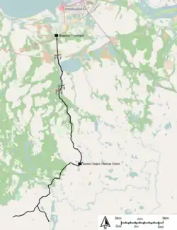 The total length of the Kudemskoy narrow-gauge railway at the peak of its development exceeded 100 kilometres (62 mi). The main station is located in the village of Beloye Ozero; the Vodogon station is located on the western outskirts of the city of Severodvinsk. Passenger trains between Vodogon and Beloye Ozero are scheduled five times a week. The railway also transports food, mail and fuel.[1] In 2010, this railway appeared in the Forbes ranking of the 10 most beautiful railway routes in the world.[2] In 2013, a new passenger car was purchased for the route.[3]