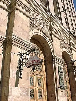 The building was richly decorated but lacked a unified stylistic direction. The parapets are in the ancient Roman style. The lobbies decorated with marble columns, stained-glass windows, and lamps in the form of candelabra are a reminiscence of Gothic interiors. The pointed turrets around the spire resemble the domes of an Eastern Orthodox church.[3] On the roof of the stylobate, there are sculptural portraits of Soviet workers and soldiers.