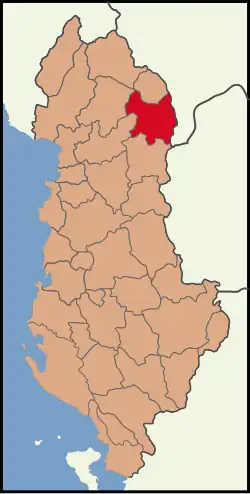 Kukës District (Albanian: Rrethi i Kukësit) was one of the 36 districts of Albania, which were dissolved in July 2000 and replaced by 12 counties. It had a population of 64,054 in 2001, and an area of 956 km2 (369 sq mi).[1] The town of Kukës was where the district's administrative headquarters were located. The area of the former district is coextensive with the present municipality of Kukës, which is part of Kukës County.