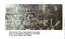 In 1966, the 42nd General Conference of the Mising Bane Kebang[2](Greater Assembly of the Misings), was held in Kulajan. The Prime Minister of India of that time Mrs.Indira Gandhi attended the Conference as the Chief Guest. In this conference, the Kebang informed the Prime Minister mainly about the Mising tribe such as how they celebrate the festival Ali Ai Ligang, their traditional food and cuisine, their language, their attires, religion and belief system. And their role in contributing to the culture and traditions of Assam.[3]