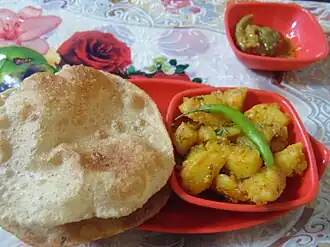 Meat is also prepared but the recipe is quite similar to the way it is prepared in most of North India, only the gravy is thinner.[7] Several snack items, breads, dairy products and beverages form the heart of the Kumaoni cuisine which is traditionally eaten in several parts in Uttarakhand.[8]