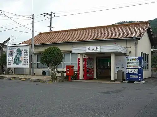 Kumayama Station (熊山駅, Kumayama-eki) is a passenger railway station located in the city of Akaiwa, Okayama Prefecture, Japan, operated by the West Japan Railway Company (JR West). [1]