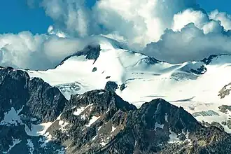 This remote glaciated peak is situated 31 km (19 mi) southwest of Lytton and is part of the Lillooet Ranges of the Coast Mountains. The nearest neighbor is Kwoiek Peak 2.35 km (1.46 mi) to the northwest and the nearest higher neighbor is Skihist Mountain, 12.82 km (8 mi) to the north.[1] Meltwater from the Kwoiek Glacier on the north slope drains into Kwoiek Creek, thence Fraser River, and precipitation runoff from the peak's south slope drains into headwaters of Mehatl Creek → Nahatlatch River → Fraser River. Topographic relief is significant as the summit rises 1,240 metres (4,068 ft) above Mehatl Creek in 2 km (1.2 mi). The first ascent of the summit was made August 16, 1958, by four members of the British Columbia Mountaineering Club: Dick Culbert, Art Dellow, Roy Mason, and Ralph Hutchinson.[4][5]