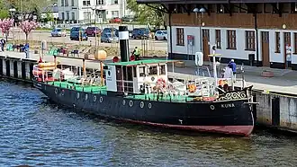 Until 1920, the ship sailed for the Königlich Preußische Weichsel-Strombauverwaltung (Royal Prussian Vistula River Works Administration).[1] After the creation of the Free City of Danzig, it was handed over to the Port and Waterways Council together with the entire icebreaker fleet and sailed under the Danzig flag.[3] During World War II, the ship sailed under the flag of the Third Reich and belonged to the Main Waterways Authority.[3] In March 1945, Kuna participated in the evacuation of the population of Gdańsk; it sailed to Kiel and Hamburg, where it was taken over by the British occupation authorities after the end of the war. Under the British flag, it served in Hamburg as an icebreaker and port tugboat until 1947, when it was handed over to the Polish Maritime Mission.[3] After returning to Gdańsk, Kuna initially belonged to the Maritime Office in Gdynia, which then handed it over to the State Water Authority in Tczew, managing inland waterways. After the renovation at the shipyard in Pleniewo, Kuna returned, under the Polish flag, to service in the lower reaches of the Vistula River.[3]