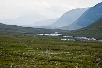 Kungsleden (King's Trail) is a hiking trail in northern Sweden, approximately 467 kilometres (290 mi) long, between Abisko in the north and Hemavan in the south.[1] The full distance breaks down into 419.3 km of trekking, 18.2 km of lake crossings and a 29.5 km stretch of road, almost all of which hikers cover by bus. It passes through, near the southern end, the Vindelfjällen Nature Reserve, one of the largest protected areas in Europe. In the winter Kungsleden is a ski trail with approximately the same route.