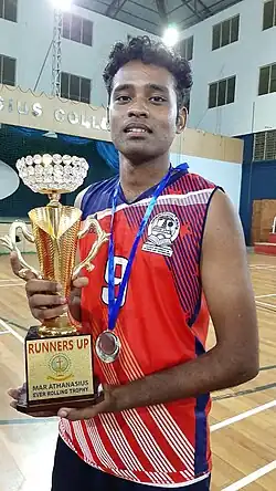 In 2018, the KMSME volleyball team created history by winning the university championship for the first time under the captaincy of Nitheesh Sasankan. On seeing his performance, he was trialed by Kochi Blue Spikers for their 2018 season squad. He was picked but were on put on the reserves list in case of any injury backup.[8][9][10]