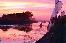 The ceremony begins with two white scout canoes that are sent to check the depth of the water and for the presence of any enemies. Once the scouts signal the "all clear", the journey to the highland begins. The Litunga’s royal boat is followed by another boat for his wife and another for the Prime Minister. The journey to Limulunga normally takes about 6–8 hours. Drums beat throughout to coordinate and energise those paddling the barge.[5] The most important are the three royal war drums – kanaona, munanga, and mundili – each more than one metre wide and said to be at least 170 years old.[6]