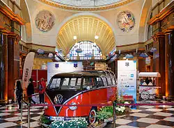 The building is divided into two equal-sized wings. In the south wing is the large central pillar-lined concert hall (Friedrich von Thiersch Hall), with a parquet floor and balcony. The concert and event hall has 1,350 seats and measures 40 × 18 × 17 m. At the front end of the south wing is the "Muschelsaal" (Shell Hall). Originally the South Reading Room, it was decorated with frescoes by the Art Nouveau painter Fritz Erler and by Alexander von Salzmann, and with pebbles and shells symbolizing water and earth.[14] A number of smaller function rooms, named after Carl Schuricht, Carl von Ibell, Fyodor Dostoyevsky, Ferdinand Hey'l and the emperor, offer a variety of spaces for events. At the other end, facing the park, the south wing ends in a winter garden. The north wing houses the smaller ballroom (Christian Zais Hall), a restaurant, and the main portion of the Wiesbaden Casino, which offers roulette, blackjack, and poker. Stucco decoration on the ceilings of the concert hall and reading room are by Arthur Storch.[15]