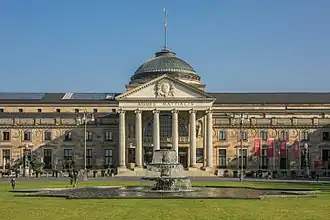 The Kurhaus ("cure house", German pronunciation: [ˈkuːɐ̯haʊ̯s])[1] is the spa house in Wiesbaden, the capital of Hesse, Germany. It serves as the city's convention centre,[2] and the social center of the spa town. In addition to a large and a smaller hall, it houses a restaurant and the Wiesbaden Casino, or Spielbank, which is notable for allowing the "highest roulette stakes in Germany" (as of 2005),[3] and where Fyodor Dostoyevsky was said to have received the inspiration for his novel The Gambler.[4]