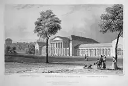 Wiesbaden has a long history as a spa town. The Romans already knew of the thermal springs of Wiesbaden. The name of the city is derived from Wisibada, the bathing place in the meadows. In 1810, the first spa house was built by Christian Zais.[8] This was a beautiful but relatively modest building with a columned portico, including Doric and Ionic features,[5] in classical style. Johann Wolfgang von Goethe praised the building on one of his many visits. During the 19th century, the benefits of the spa attracted the upper classes. The number of spa visitors, 20,000 in 1840, had increased tenfold by 1910.