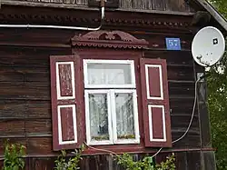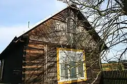 Characteristic elements of the material culture of Puszcza Biała also included architecture and wooden decorations. When building a house, sill plates were laid on stones. Later, a base made of cement, bricks, or concrete blocks was introduced. The log walls were made from beams connected at the quoins using either the notch or dovetail joint technique. The quoins of the log structure and the gable wall extended slightly beyond the face of the house. Their ends were decoratively profiled. The roofs were gable, constructed using a rafter system, and covered with straw.[59] After 1918, larger houses began using posts to support the rafters, influencing changes in the gable decorations. Several pairs of thin crossed poles were placed on the roof ridge. After 1918, roofs began to be covered with shingles or wood chips. Wealthier farmers used roof tiles. Doors and windows were fitted into pre-prepared openings, cut into the house's frame. They were often set in posts, combining the log structure with the post-and-plank construction. Initially, double-leaf windows with 4 or 6 panes were used.[59] In the early 20th century, two- and three-part windows became common. In three-part windows, a small transverse window at the top could be opened. Doors were single-leaf, made of double layers of boards. They were decorated with strips of wood laid in geometric patterns and studded with nails with large heads. In later-built wide-front houses, the doors were double-leaf, made of panels, decorated, and painted. As it became harder to obtain wood, houses were built with thinner wood, which made them less warm and caused them to become damp more quickly. Therefore, houses began to be weatherboarded. In the early 19th century, rich house decorations appeared. The peak of this art was in the 1930s.[59] Carved decorations covered the corners, cornices above and below the windows, roof gables, windbreaks, doors, and porches, and were extremely diverse. The gable wall of the house was the most decorated, as it was the representative part. Gables were decorated with boards laid in various geometric patterns: diamonds, triangles, squares, and herringbone. The perforated boards protecting the external roof covering (windbreaks) at the point of intersection on the ridge took the form of śparogi. They resembled horse, ram, or bird heads, or animal horns. The lacy cornices above the windows were called korunamy. When wide-front houses appeared, with the longer wall facing the road, porches began to be richly decorated.[59][60]