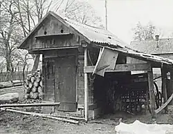 The relocation of the Kurpie to Puszcza Biała necessitated a shift to more planned settlement patterns. The villages in the forest were organized as przysiółeks and linear settlements. In the 19th century, most of them were transformed into Zeilendorfs due to land reform and emancipation.[30] The farmsteads were laid out in a rectangular plan, within which the house and outbuildings were constructed. The house always faced the road with its gable wall, close to which it was placed. At the back of the farmstead was a barn, with its front wall facing the house, sometimes featuring a so-called wystawka (a space for carts, sledges, and agricultural tools). On one side of the farmstead were the granary, woodshed, and pigsty, while on the other side were the cowshed and stable. Feed for horses and cattle was stored in the attics of the cowshed and stable. Chickens, geese, and ducks were raised. Grain and valuable agricultural tools were stored in the granary, straw stacks, and sacks. In the yard, a well was dug and a dugout, known as a śklep or parsek, was built. Next to it was a vegetable garden (sometimes also an orchard). The area beyond the yard, enclosed by a wooden fence, was called the gardens, where cows, horses, and geese were grazed. Sometimes this area was used for drying flax and linen. Hay barracks from the meadows were set up behind the barn.[30][31]