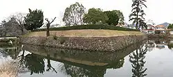 Kuruwa (曲輪; くるわ) is a Japanese term for the walls of a Japanese castle, and the regions bounded by the arrangement of those walls. The term may also be written as 郭, and the term maru (丸) is also used for castles built after the Edo period. The kuruwa serves as a defensive territory, provides space for additional castle facilities, and contains the living quarters for common soldiers, making it an important fixture of all Japanese castles. Most castles built during the Middle Ages contain many kuruwa of small area, while those built during or after the early modern period often contain a lesser number of kuruwa of larger area. The western equivalent is the motte-and-bailey.