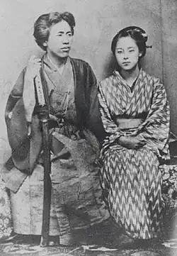 Ine continued her studies in Nagasaki under Abe Roan.[h][10] In 1854 she left Tada with her mother and went with Ninomiya Keisaku's nephew Mise Shūzō to study under Keisaku in Uwajima, whose lord, the daimyō Date Munenari, enthusiastically promoted Western learning.[11] After he suffered a stroke in 1856, Keisaku returned to Nagasaki with Ine and Shūzō.[12]
