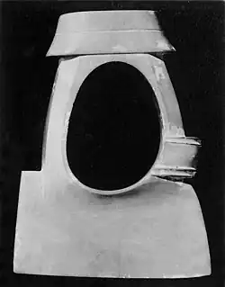 Kuwagata-ishi take the form of a stone bracelet[3] in the shape of the blade of a hoe.[1] Their development has been traced back to shell bracelets and/or armlets of the Yayoi period.[4][5][6] Alongside sharin-seki ("carriage-wheel stones") and ishi-kushiro ("stone bracelets"), kuwagata-ishi are one of the three types of bracelet-shaped stone artefact known in large numbers from kofun of the early- to mid-Kofun period.[5] While they may have been worn as pendants, it is thought their primary function was to serve as grave goods.[4][6]