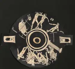 Greek kylixes and other vessels during the Archaic period frequently depicted activities such as athletic training events that were favored by their users, the majority of which were part of the aristocracy.[7] Kylixes where often used at symposiums which were all male drinking parties. Symposiums were considered an integral part of Greek culture and was an activity reserved for only the most elite of society.[8] The party was held in a private home where the men would get together to drink, eat, sing and discuss various topics such as philosophy and politics; the only women who were allowed to attend were high-class entertainers. It was an activity that served to reinforce the status and bond of the aristocracy.[8] Athletic events were also an important part of Greek culture as they believed in the importance of training their bodies just as much as they trained their minds.[9] The Grecian youths of elite families would train under athletic trainers at a palaestra or a wrestling school.[9] These training sessions where a key part of youth socialization in society.[7]