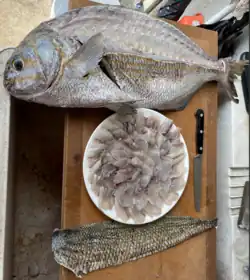 It can be prepared as poke, a local Hawaiian dish consisting of raw fish and some seasonings or as sushi or sashimi. It can be grilled whole, then the skin peeled back and eaten.[4] Nenue has a mild taste with a slight hint of limu or seaweed (also part of this fish's diet).[5]