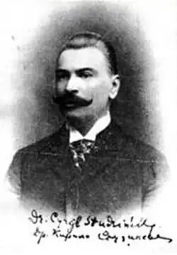 Kyrylo Studynsky, also known as Kyrylo Studynskyi[1] (Ukrainian: Кири́ло Йо́сипович Студи́нський; 4 October 1868 – 1941),[2] was a western Ukrainian political and cultural figure from the late-19th to the mid-20th century. One of the principal figures within the Christian Social Movement in Ukraine, in 1939 Studynsky became head of the People's Assembly of Western Ukraine following the Soviet annexation of Western Ukraine, 1939–1940, and led the delegation to Moscow that formally requested the inclusion of Western Ukraine to the Soviet Union.