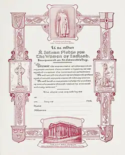 The names of signatories were recorded in ledgers, though few of these records still exist.[4] The pledge could also be signed on a decorated certificate, one of which is held in the collection of the National Museum of Ireland.[3] Estimates suggest that two thirds of Irish women signed the Lá na mBan pledge.[5][1]