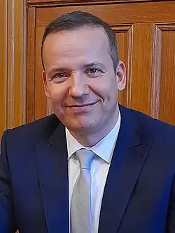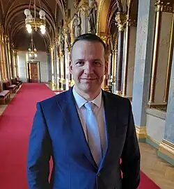 László Toroczkai (born 10 March 1978) is a Hungarian politician, journalist, leader of the far-right[6] Our Homeland Movement political party, and former mayor of Ásotthalom. He is also a member of the Parliamentary Assembly of the Council of Europe, and vice-president of Board of the Hungarian National Group of the Inter-Parliamentary Union (2022-2026).[7] Also chairman of Hungary-Bahrain Friendship Group 2022-[8] and chairman of Hungary-Rwanda Friendship Group 2022-[9]