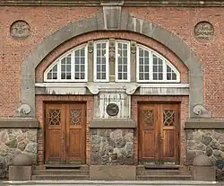 Læssøgade School is a three-story building constructed of red brick on a base of granite in the National romantic style with elements of Baroque revival.[2] The corners of the building are accentuated as avant-corps with shadow joints and lesenes. The school was constructed as a 4-winged structure around an atrium similar to the Samsøgade School, completed a few years earlier. However, in Læssøgade School the atrium roof is at the same level as the roofs of the rest of the buildings and not at the 1st floor like in Samsøgade School. This difference creates an imposing spacious atrium which at the time was an unusual feature. In 1969 the school was expanded with toilet buildings in the school yard and an additional, smaller building to the north.[3]