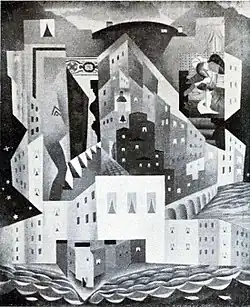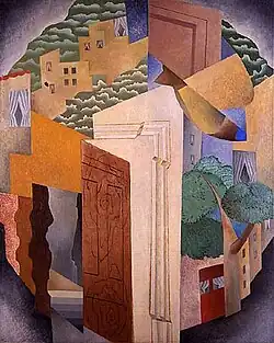 Beginning in 1917, Survage shared a studio—and a penchant for alcoholic excesses—with Amedeo Modigliani in Paris. Survage later moved to Nice and, over the next eight years, produced highly structured oils and works on paper linked together by a series of leitmotifs, repeating groups of symbolic elements—man, sea, building, flower, window, curtain, bird—as if they were protagonists in a series of moving images. The influence may have been Marc Chagall's, an artist well known for his insertions of floating couples, cows, roosters, and sundry Jewish iconography. By 1922, Survage had begun to move away from Cubism in favour of the neo-classical form. He was perhaps influenced by commissions for Serge Diaghilev's Ballets Russes, beginning with sets and costumes for Igor Stravinsky's opera buffa Mavra at the Paris Opéra in 1922. Although mainly a painter, he also produced stage, tapestry, and textile designs during this period (notably for the house of Chanel in 1933). Toward the end of the 1930s, as a result of his contact with André Masson, Survage became increasingly charmed by symbols and mysticism. The curvilinear forms that had previously dominated his compositions came, once again, under the control of geometric structure.[2]