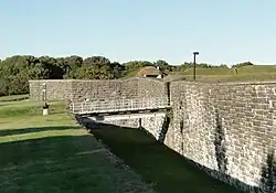 The easternmost of the three forts, Fort No. 1, has been a National Historic Site of Canada since 1920[1] and underwent restoration in the 1970s.[2] The casemates of the polygonal fort feature exhibits about the history of the site, and include a multimedia presentation, scale models, period illustrations, interactive games, and antique tools and materials. Guided tours are offered of the casemates, tunnels and underground chambers, and visitors can take self-guided tours of the outdoor retractable bridge, terreplein, powder magazines, and caponiers.
