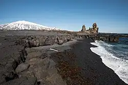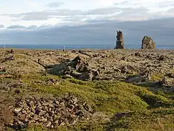The Lóndrangar (Icelandic pronunciation: [ˈlounˌtrauŋkar̥]) are a pair of rock pinnacles in Iceland. They are volcanic plugs of basalt, that have been hewn out from softer surrounding rock by erosion. At 75 and 61 m tall, they are a singular sight, rising above and outside the ocean front due east across from Malarrif [ˈmaːlarˌrɪːf] and some 10 km from Hellnar, on the southern coast of Snæfellsnes peninsula. History has it that the taller of the cliffs was ascended in 1735, while the smaller one was not climbed until 1938.[1]