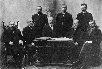 ![]() From left to tight: Sven Aarrestad, Sofus Arctander, Karl F. Griffin Dawes, Prime Minister Løvland, Magnus Halvorsen, Abraham Berge, Johan Bredal and Jørgen Brunchorst | |