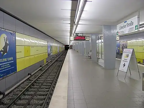 Lübecker Straße is a metro station located in Hohenfelde, Hamburg, Germany. It was built and first opened on 1 March 1912, originally located in a terrain cutting. Between 1958 and 1960 the station was rebuilt into an underground, reopened on 2 July 1961.