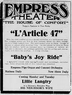 L'Article 47 is a 1913 American silent short drama film starring William Garwood, Victory Bateman, Howard Davies, Ethel Jewett, and Ernest Joy. The film is based on the 1872 French play of the same name by Adolphe Belot.