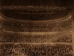 One evening of location shooting became famous (4 October 1923). For the scene of Claire Lescot's concert L'Herbier hired the Théâtre des Champs-Élysées and invited over 2000 people from the film world and fashionable society to attend in evening dress and to play the part of an unruly audience. Ten cameras were deployed around the theatre to record their reactions to the concert.[10] This included the American pianist George Antheil performing some of his own dissonant compositions which created a suitably confrontational mood, and when Georgette Leblanc appeared on stage the audience responded with the required tumult of whistles, applause and protests, as well as some scuffles. The audience is said to have included Erik Satie, Pablo Picasso, Man Ray, Léon Blum, James Joyce, Ezra Pound and the Prince of Monaco.[11][12]