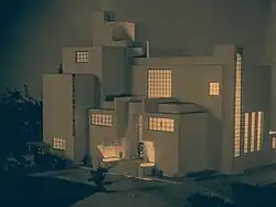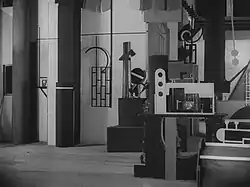 A wide range of practitioners in different fields of the arts worked on the film, meeting L'Herbier's ambition of creating a film which united many forms of artistic expression. Four designers contributed to the sets. The painter Fernand Léger created the mechanical laboratory of Einar Norsen.[13] The architect Robert Mallet-Stevens designed the exteriors of the houses of Norsen and Claire Lescot, with strong cubist elements. Alberto Cavalcanti and Claude Autant-Lara, soon to be directing their own films, both had a background in design; Autant-Lara was responsible for the winter-garden set and the funeral vault, while Cavalcanti designed the geometric dining hall for Claire's party, with its dining-table set on an island in the middle of a pool.[14] Costumes were designed by Paul Poiret, furniture by Pierre Chareau and Michel Dufet, jewellery by Raymond Templier, and other "objets" by René Lalique and Jean Puiforcat. The choreographed scenes were provided by Jean Börlin and the Ballets Suédois. To bind the whole together L'Herbier commissioned the young Darius Milhaud to write a score with extensive use of percussion, to which the images were to be edited.[5] (This musical score which was central to L'Herbier's conception of the film has not survived.[15]) The final sequence of the film, in which Claire is 'resurrected', is an elaborate exercise in rapid cutting, whose expressive possibilities had recently been demonstrated in La Roue. In addition to the juxtaposition and rhythmic repetition of images, L'Herbier interspersed frames of bright colours, intending to create counterpoint to the music of Milhaud and "to make the light sing".[16]