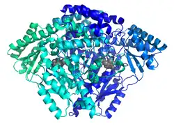 ![]() Cartoon depiction of C-truncated HDC dimer with PLP residing in active site. | |||||||||