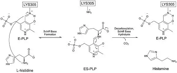 - ^ a b Fernandes HS, Ramos MJ, Cerqueira NM (July 2017). "The Catalytic Mechanism of the Pyridoxal-5'-phosphate-Dependent Enzyme, Histidine Decarboxylase: A Computational Study". Chemistry: A European Journal. 23 (38): 9162–9173. doi:10.1002/chem.201701375. PMID 28613002.