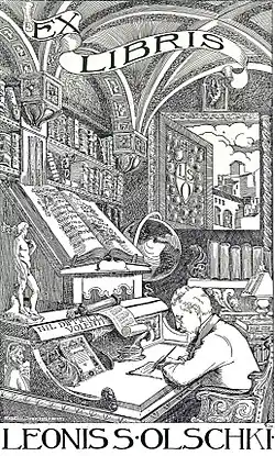 Leo S. Olschki came from a family of typographers of Jewish ancestry. Born in nowadays Poland (then part of Prussia), he moved to Berlin in 1879 and to Verona in 1883, where he became manager of the publishing house Libreria Antiquaria Münster and printed his first incunables.[1] The firm moved ot Venice in 1890 and to Florence in 1897, where it is still based today.