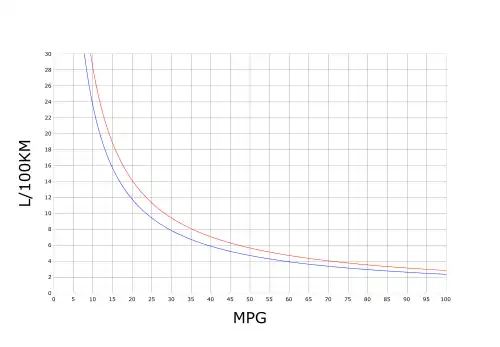 - Generally expressed in liters per 100 kilometers (L/100 km), used in most European countries, Canada, China, South Africa, Australia and New Zealand. Irish law allows for the use of miles per imperial gallon, alongside liters per 100 kilometers.[2] Liters per 100 kilometers may be used alongside miles per imperial gallon in the UK. The window sticker on new US cars displays the vehicle's fuel consumption in US gallons per 100 miles, in addition to the traditional mpg number.[3] A lower number means more efficient, while a higher number means less efficient.